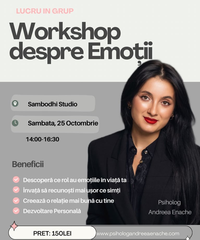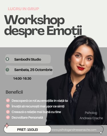 Workshop-ul este facilitat de Psiholog Andreea Enache, care te va însoți cu profesionalism și empatie în procesul de explorare a propriilor emoții.